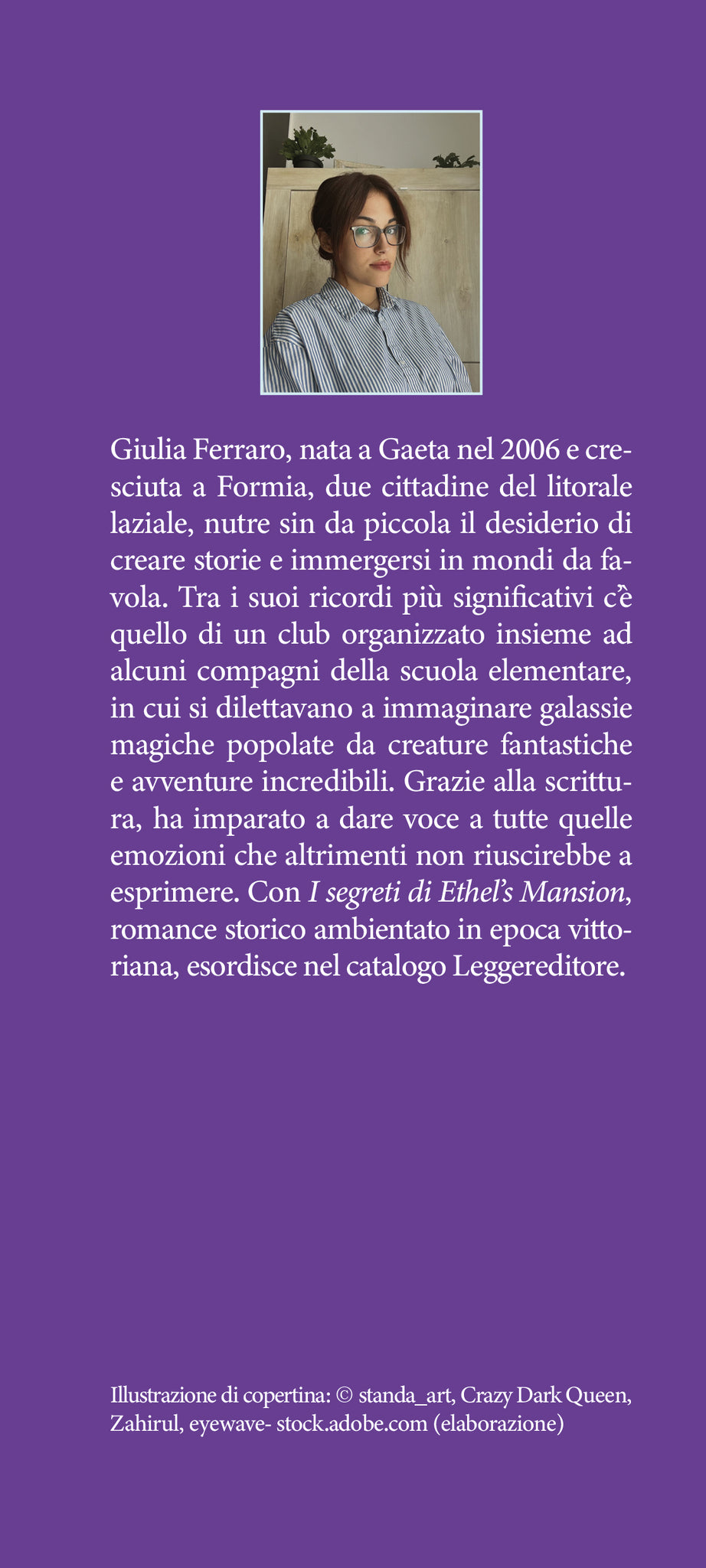 Giulia Ferraro, nata a Gaeta nel 2006 e cresciuta a Formia, due cittadine del litorale laziale, nutre sin da piccola il desiderio di creare storie e immergersi in mondi da favola. Tra i suoi ricordi più significativi c’è quello di un club organizzato insieme ad alcuni compagni della scuola elementare, in cui si dilettavano a immaginare galassie magiche popolate da creature fantastiche e avventure incredibili. Grazie alla scrittura, ha imparato a dare voce a tutte quelle emozioni che altrimenti non riuscirebbe a esprimere. Con I segreti di Ethel’s Mansion, romance storico ambientato in epoca vittoriana, esordisce nel catalogo Leggereditore.