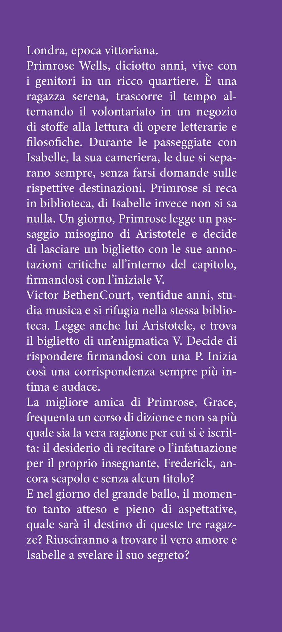 Primrose Wells, diciotto anni, vive con i genitori in un ricco quartiere. È una ragazza serena, trascorre il tempo alternando il volontariato in un negozio di stoffe alla lettura di opere letterarie e filosofiche. Durante le passeggiate con Isabelle, la sua cameriera, le due si separano sempre, senza farsi domande sulle rispettive destinazioni. Primrose si reca in biblioteca, di Isabelle invece non si sa nulla. Un giorno, Primrose legge un passaggio misogino di Aristotele e decide di lasciare un biglietto con le sue annotazioni critiche all’interno del capitolo, firmandosi con l’iniziale V.